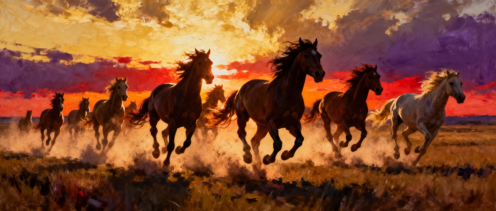 Divji konji in galop v sončni zahod